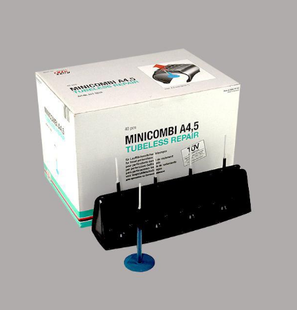 МИНИКОМБИ комбинированный элемент для ремонта: проколов, сквозных повреждений, в протекторной части радиальных и диагональных, камерных и бескамерных шин всех видов транспорта. Ремонт является наиболее надежным и технологичным, т.к. одновременно с наложением латки изнутри покрышки ножка заполняет канал прокола, защищая каркас шины от попадания влаги и преждевременной коррозии. Предотвращает проникновение воды, грязи, и инородных тел, которые могут привести к преждевременному разрушению каркаса и брекерного слоя. Для лучшего скрепления МИНИКОМБИ с покрышкой рекомендуется использовать клей для бескамерных шин.